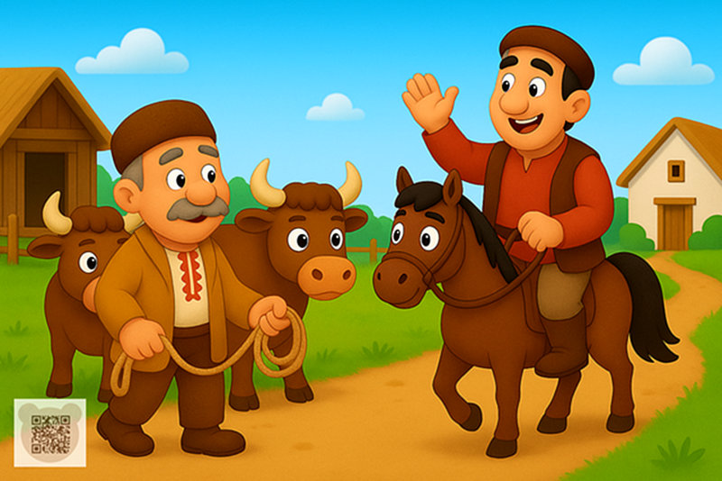 Проміняв дід волів на коня й поїхав далі, задоволений.