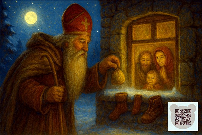 Одного разу він дізнався про бідну сім’ю, у якій не вистачало грошей навіть на одяг та їжу. Тоді Миколай вирішив допомогти — але таємно, щоб ніхто не знав, що це він. Уночі він підходив до будинку й кидав мішечки із золотом у вікно або димар, де сушилися шкарпетки й черевички.