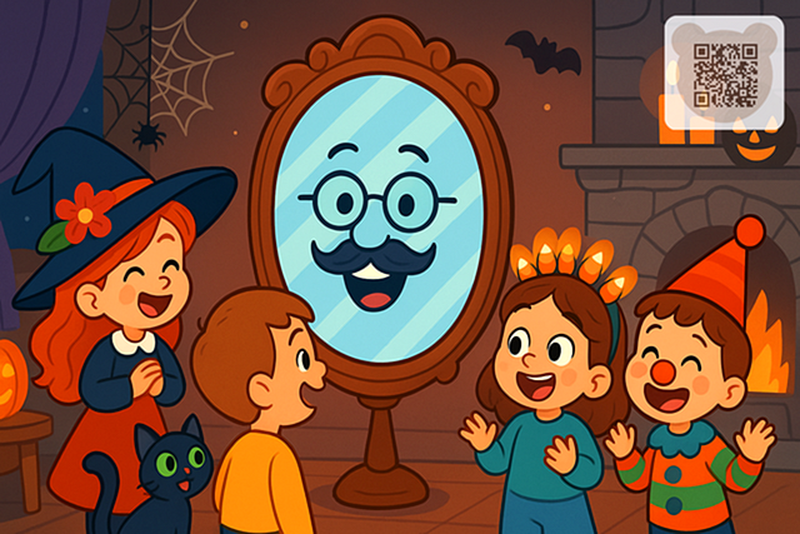 На Хелловін діти прийшли до відьминого дому, зазирнули в дзеркало й попадали зі сміху. Один хлопчик побачив себе з хвостом павича, дівчинка — з вінком із опромінених цукерок, а найсерйозніший малюк раптом опинився в костюмі клоуна.