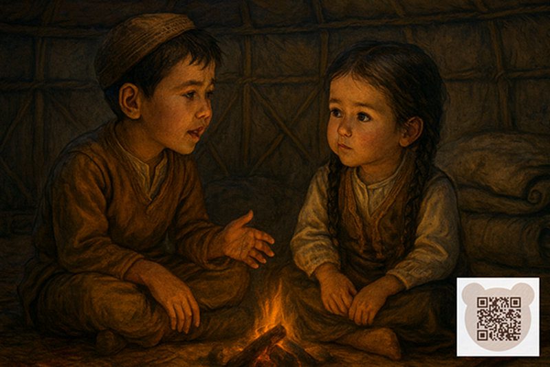 Недалеко від замерзлої річки, де степ упирався в невисокі пагорби, стояла бідна юрта. Її повсть була ветха, а дерев’яний каркас скрипів під натиском крижаного вітру. У цій юрті жила родина: батько Жомарт, мати Асель і двоє дітей — брат Арман і сестра Айим.