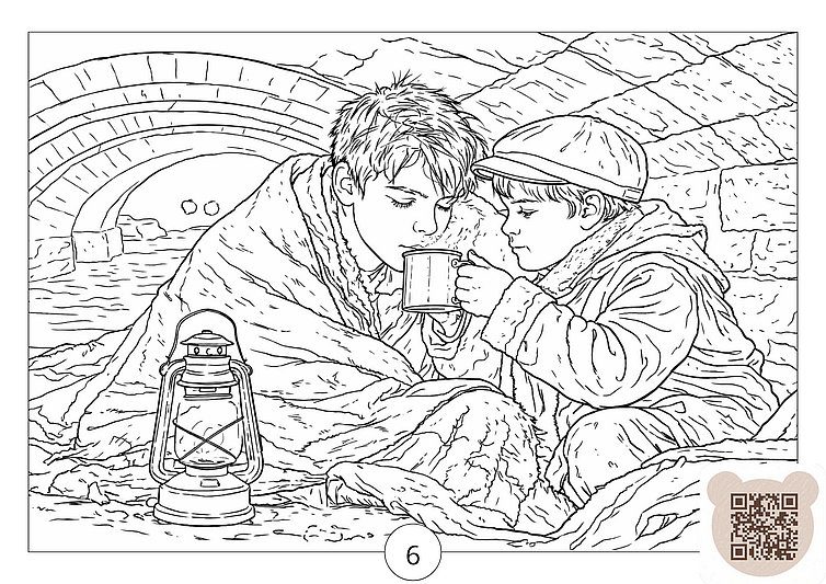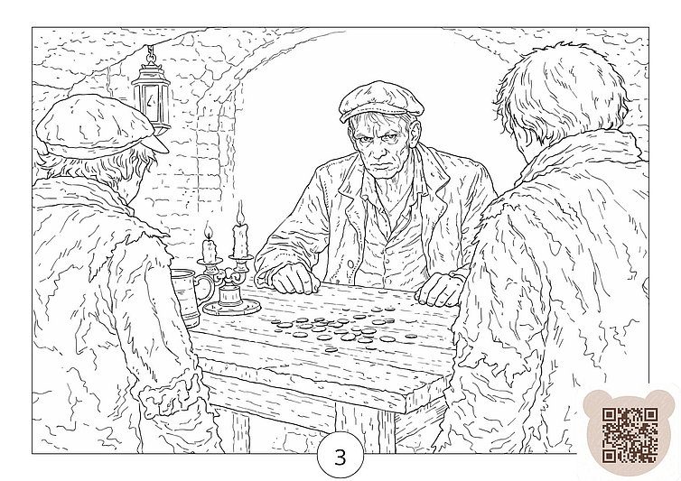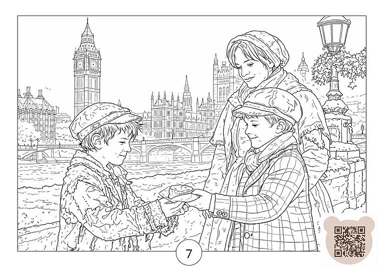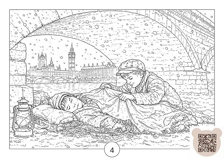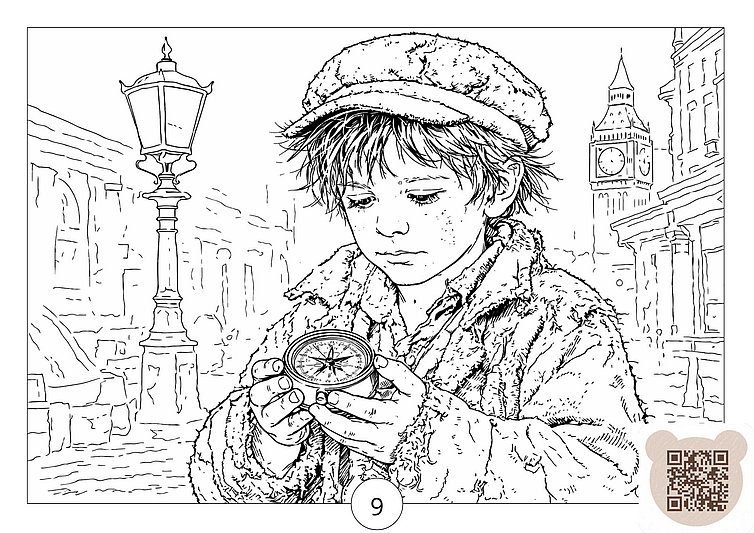 Перед вами не просто різдвяна розмальовка, а справжнє художнє занурення у вікторіанську епоху. Ця ілюстрація до різдвяної казки-бувальщини про маленького хлопчика Фінна створена в стилі класичної книжкової графіки. Вона свідомо позбавлена звичної «мультяшності», щоб дати дитині можливість відчути глибину історії, попрацювати з тінями та світлом старого міста.