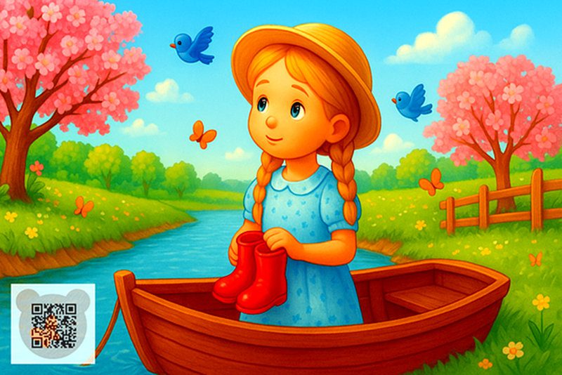 Човен усе далі нісся; Герда сиділа тихо, в самих тільки панчохах; її червоні черевички пливли за човном, але не могли його наздогнати.