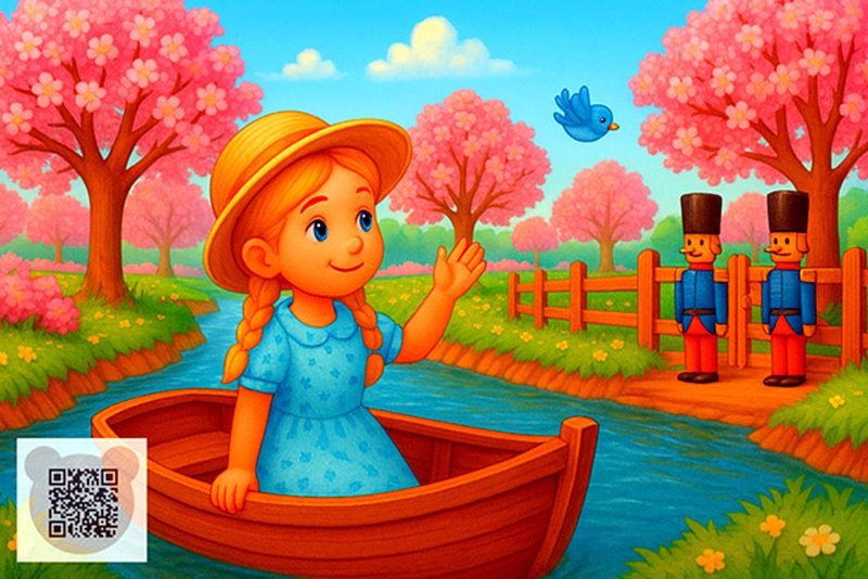 «Може, річка несе мене до Кая!» — подумала Герда, повеселішала, стала на ноги й довго-довго милувалася красивими зеленими берегами. Але ось вона підпливла до великого вишневого саду, у якому притулився будиночок з кольоровими шибками у віконцях і солом’яною стріхою. Біля дверей стояли два дерев’яні солдати й віддавали рушницями честь усім, хто пропливав повз.