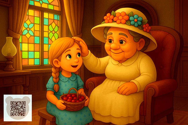 Вікна були високо від підлоги й усі з різнобарвних: червоних, блакитних і жовтих шибок; сама кімната була освітлена якимось дивовижно яскравим, веселковим світлом. На столі стояв кошик із чудовими вишнями, і Герда могла їсти їх скільки душа забажає; поки ж вона їла, бабуся розчісувала їй волосся золотим гребінцем. Волосся вилося кучерями й оточувало свіже, кругле, немов троянда, личко дівчинки золотавим сяйвом.