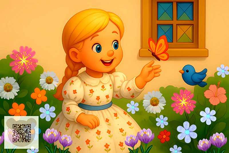 Герда почала розповідати їй про все, а бабуся похитувала головою й повторювала: «гм! гм!» Але от дівчинка закінчила й спитала стару, чи не бачила вона Кая. Та відповіла, що він тут ще не проходив, але певно пройде, тож дівчинці поки нема чого сумувати — хай краще спробує вишень та помилується квітами, що ростуть у саду: вони красивіші за намальовані в будь-якій книжці з картинками і всі вміють розповідати казки! Тут бабуся взяла Герду за руку, повела до свого будиночка й замкнула двері на ключ.